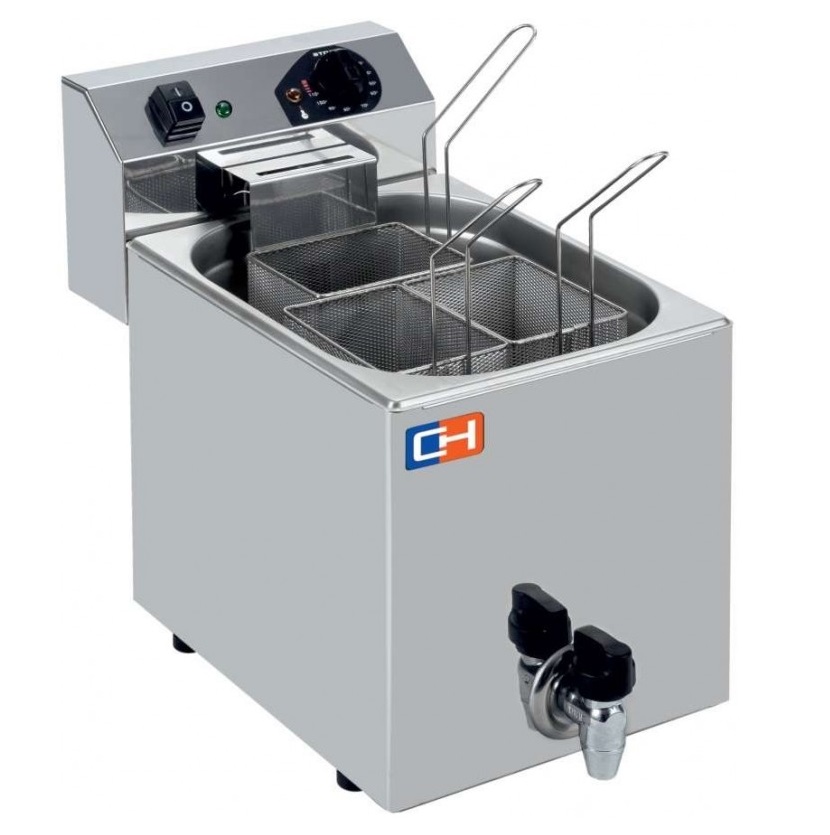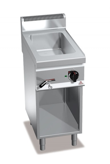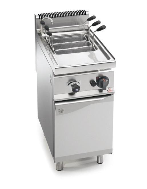 Los cuecepastas están destinados eminentemente a cocer pasta fresca de forma muy rápida y muy precisa. Los más pequeños de sobremesa parten de unos 7 L de capacidad, y los más grandes de pie tienen cubas que llegan a 40 L. Los hay para muy altas producciones destinados a obradores, que llegan a 150 L y tienen sistemas de elevación automáticos y sistema de enfriamiento automático e inmediato, pero eso ya es otro rango de maquinaria. Los modelos más económicos acostumbran a incluir las cestas y son eléctricos y de sobremesa; en los modelos más grandes debes asegurarte: al ser compatibles con medidas GN, es probable que no se incluyan porque se entiende que cada cliente querrá una combinación u otra de cestas. Por ejemplo, en un cuecepastas de 1 GN 1/1 de capacidad, lo podemos derivar en 2 GN 1/3 y 3 GN 1/9, por eso a veces no se incluyen, o bien podemos complementar las que vienen de serie. Los modelos más grandes generalmente pertenecientes a gamas modulares, ya pueden ser tanto eléctricos como a gas. Como el baño maría, en general disponen de grifo de vaciado para facilitar la descarga de agua usada. En los modelos más grandes, podemos conectar el desagüe al desagüe del local. Los modelos más grandes disponen de toma de agua, porque llenar a garrafas 40 L de agua es bastante incómodo. Recuerda que es mejor que uses agua tratada porque está directamente en contacto con el alimento.