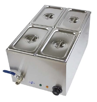 El origen de la técnica de cocción al baño maría se atribuye a María la Judía, alquimista del siglo III. Según se cree, originalmente se trataba de un baño de arena y cenizas que calentaba otro recipiente con agua que a su vez calentaba al siguiente. Y eso es el baño maría: un recipiente con agua caliente, en el que introducimos otro recipiente para mantener el calor y/o cocinar. Normalmente está construido íntegramente en acero inoxidable, y también por lo general se adapta a las medidas GN. Los más pequeños son de medida GN 1/2 o GN 1/1, y gracias a los separadores podemos conseguir distintas combinaciones con cubetas más pequeñas. Trabajan normalmente hasta +90ºC, de forma que el agua que transmite el calor no llega a hervir, si alcanzase la ebullición se evaporaría. Los más básicos sond e sobremesa y eléctricos; en gamas modulares con modelos de pie los podemos encontrar eléctricos o a gas, pero estos últimos son menos habituales. Normalmente incluyen de serie el grifo de vaciado, las cubetas, y las tapas, pero asegúrate de todo en la descripción o en la ficha técnica.