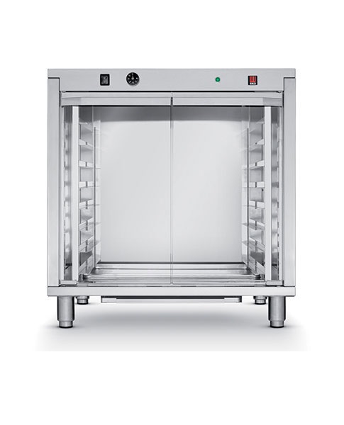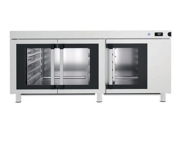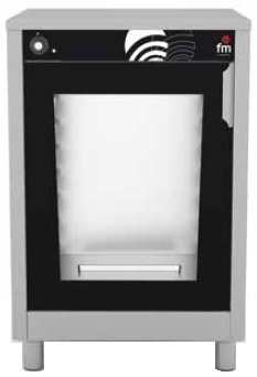 El rango de temperatura habitual es de +30 ºC a +90 ºC, aunque en la práctica rara vez se superan los 40 ºC, ya que las levaduras dejan de activarse por debajo de 26 ºC y mueren a partir de 55 ºC. La humedad se genera mediante un sistema manual —una cubeta con agua en la base— o automático, con toma directa de agua y control mediante pulsador o válvula. Mantener el equilibrio entre temperatura y humedad es clave para una fermentación uniforme: demasiada sequedad forma corteza antes de tiempo, y el exceso de humedad puede colapsar la estructura del pan. El control de temperatura puede ser analógico o digital. Los modelos digitales muestran la temperatura de consigna y permiten un manejo sencillo, suficiente para la mayoría de aplicaciones, aunque los armarios de fermentación controlada ofrecen mayor precisión y programación automática de ciclos. Estas máquinas son eléctricas y monofásicas, con potencias que rara vez superan 1,5 kW, ya que no necesitan alcanzar temperaturas elevadas.