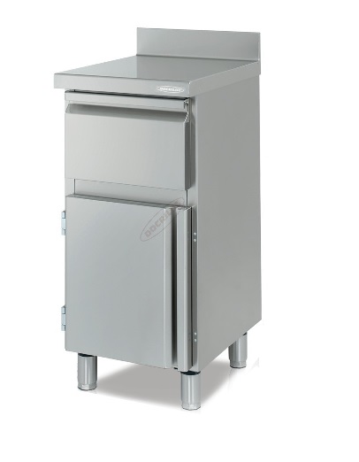 El otro gran elemento es el mueble cafetero, diseñado específicamente para soportar la cafetera y todo su entorno de trabajo. Puede ser abierto o cerrado, con estantes o puertas, y su configuración invierte la lógica del contramostrador: donde hay puertas delante, la parte trasera queda abierta para permitir el paso de instalaciones, tomas de agua y cableado. Suelen ser de fondo 60, con frontal soldado, peto posterior y un pasacables en el sobre para evitar cables a la vista. En muchos modelos se integran tolvas y cajones, desde soluciones básicas hasta conjuntos más completos con cajones dobles y guías telescópicas.