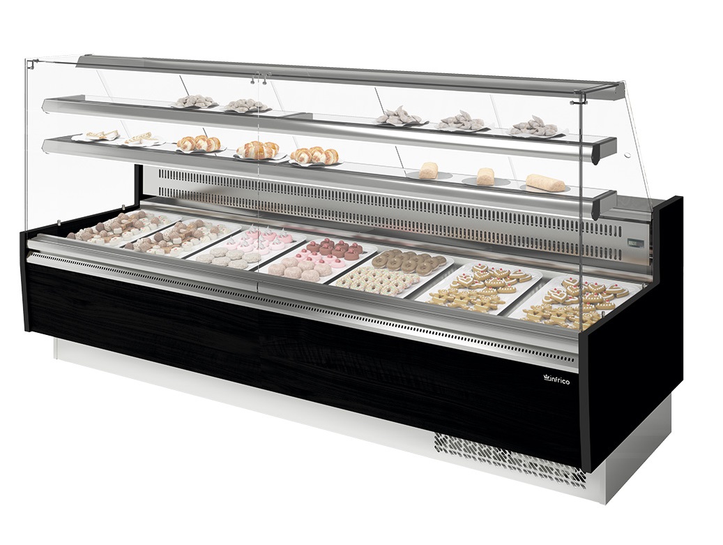 Las vitrinas más golosas son las vitrinas de pastelería y de heladería, claro. En la vitrina de pastelería el frío es más delicado, para no resecar el producto, y unos pocos modelos disponen de reserva. El cristal es normalmente recto y la estética muy bonita. Además, las hay específicas para chocolate que además de un sistema de frío muy preciso, también trabajan con temperaturas más altas y tienen un plano de exposición más alto para poder exponer bombones y creaciones de chocolate. La vitrina de heladería es obviamente de congelación pero acostumbra a trabajar con una temperatura alta dentro de ser congelado porque el helado artesanal a una temperatura muy baja cristaliza y pierde la cremosidad. En este caso, acostumbran a trabajar con cubetas específicas para helados, y más que reserva –aunque algunas también tienen- tienen dos niveles de cubetas de helados, que se colocarán las de abajo tapadas y protegidas y las iremos subiendo a medida que vayamos agotando las superiores que están a la vista del cliente.