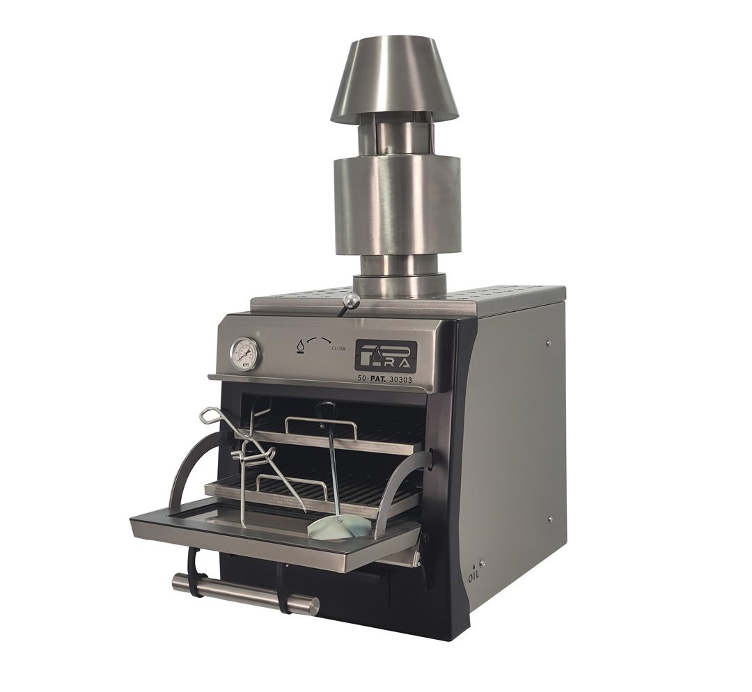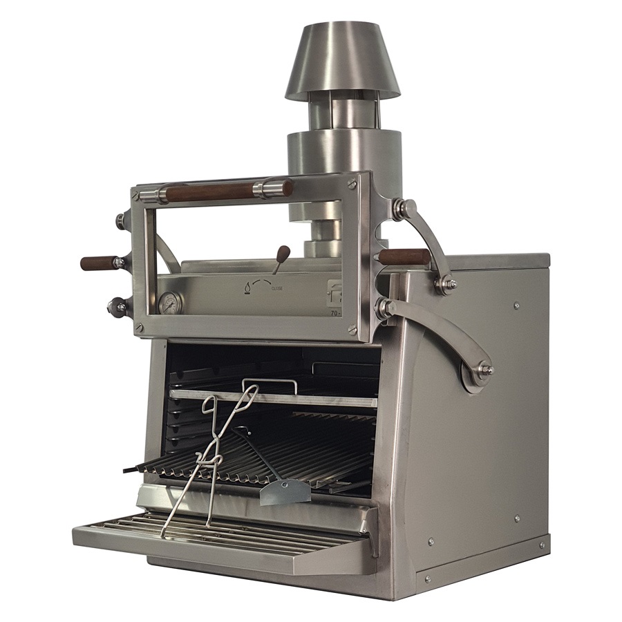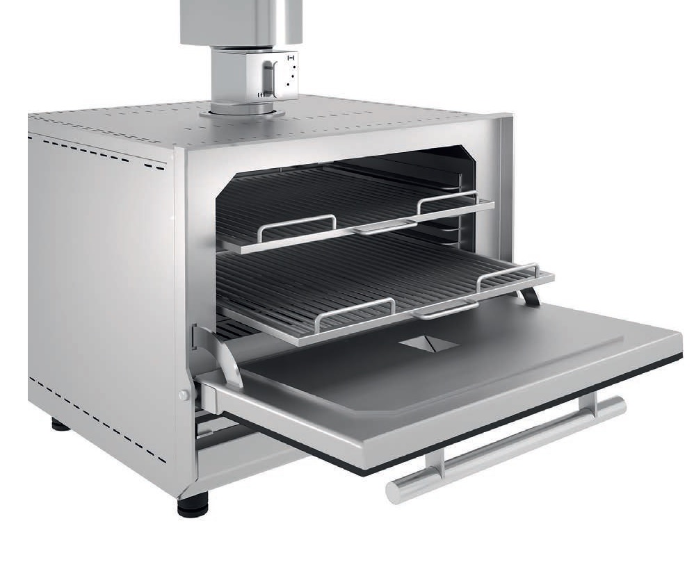 Su estructura —una caja maciza fabricada en acero inoxidable, hierro fundido o aleaciones metálicas de alta resistencia— está diseñada para soportar temperaturas extremas y un uso continuo. La puerta suele ser ciega, aunque algunos modelos incorporan ventanas de cristal templado o incluso puertas totalmente acristaladas que permiten observar la cocción sin necesidad de abrir, evitando así pérdidas de temperatura. En cuanto al sistema de apertura, la mayoría son abatibles hacia abajo, lo que convierte la puerta en una práctica superficie auxiliar para apoyar bandejas o utensilios, aunque hay fabricantes que apuestan por puertas elevables de cristal, mucho más ergonómicas y seguras, ya que evitan el riesgo de pasar los brazos por encima de una superficie caliente. Las parrillas interiores, siempre de acero inoxidable o fundición, son piezas pesadas y robustas pensadas para manipular directamente sobre las guías. Las medidas varían según el modelo: desde unos compactos 40 x 45 cm hasta parrillas industriales de más de 70 cm por lado. Todos los hornos de brasa incluyen una parrilla de serie junto con un atizador, unas pinzas y un cepillo de púas para mantenimiento.